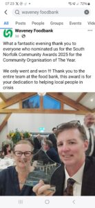 Big well done to Waveney foodbank for winning ‘community organisation of the year’ award, nominated by the public, in the South Norfolk 2025 awards!  You can read more here: facebook link