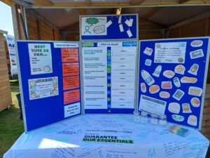 Supported by some of you lovely lot, we spent the day at NORJAM yesterday and we are there again today – plenty of water to hand! – to engage with the young people and their leaders attending this massive Scout and Guide event. We want to encourage support (one-off or ongoing) and engage them in several different activities which Rachel has put together to entertain, challenge and inform. One standout comment from yesterday included a conversation between two scouts, one who said she knew how to cook a meal from scratch and was surprised when her friend said she didn’t know; when asked ‘didn’t your mum teach you?’ the friend’s response was ‘no, she works, she’s too busy.’ We also noticed that for the ‘make a meal for £5’ challenge, the majority included a cucumber – is that a staple food item for a teenager these days…? We’re looking forward to today and more chats and thoughts from the children and leaders, as well as welcoming their leftovers – we have already received 3 crates filled with pot noodles, tuna, UHT milk and crisps!
